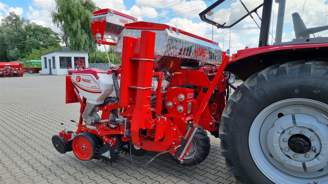 Siewnik do buraków, rzepaku, kukurydzy HMS Pinadisc wyposażony jest w podciśnieniowe sekcje wysiewające z mechanicznym napędem od koła siewnika. Maszyna doskonale sprawdzą się podczas siewu kukurydzy, zastosowanie odpowiedniej tarczy wysiewającej daje możliwość precyzyjnego wysiewu buraka, rzepaku, słonecznika, soi czy innych roślin które mogą zostać wysiane punktowo. Dmuchawa o dużej wydajności tworzy podciśnienie, dzięki któremu nasiona rośliny przywierają do otworów w tarczy, a następnie trafiają do redlicy wysiewającej. Dwutalerzowa redlica wysiewająca tworzy wąski rowek przypominający kształtem literę ”V”, natomiast tylne kółka ugniatające zasypują go i ugniatają ziemię w linii siewu, co zapewnia lepsze podsiąkanie wody.